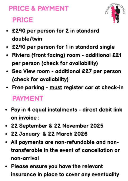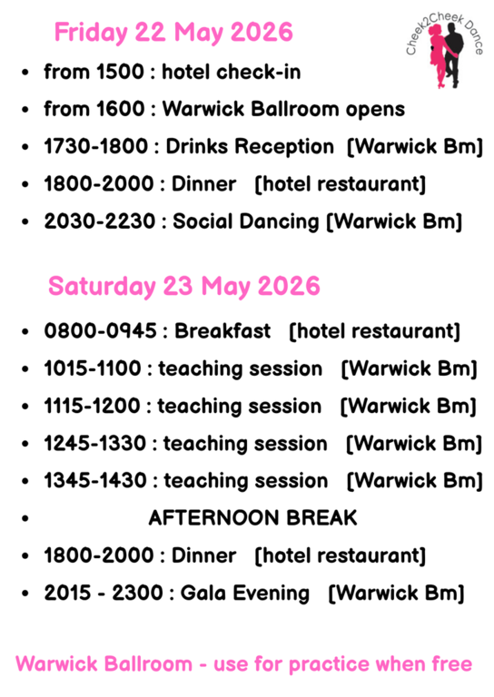 The dance weekend will consist of 6 x 45-minute teaching sessions, social dancing every evening